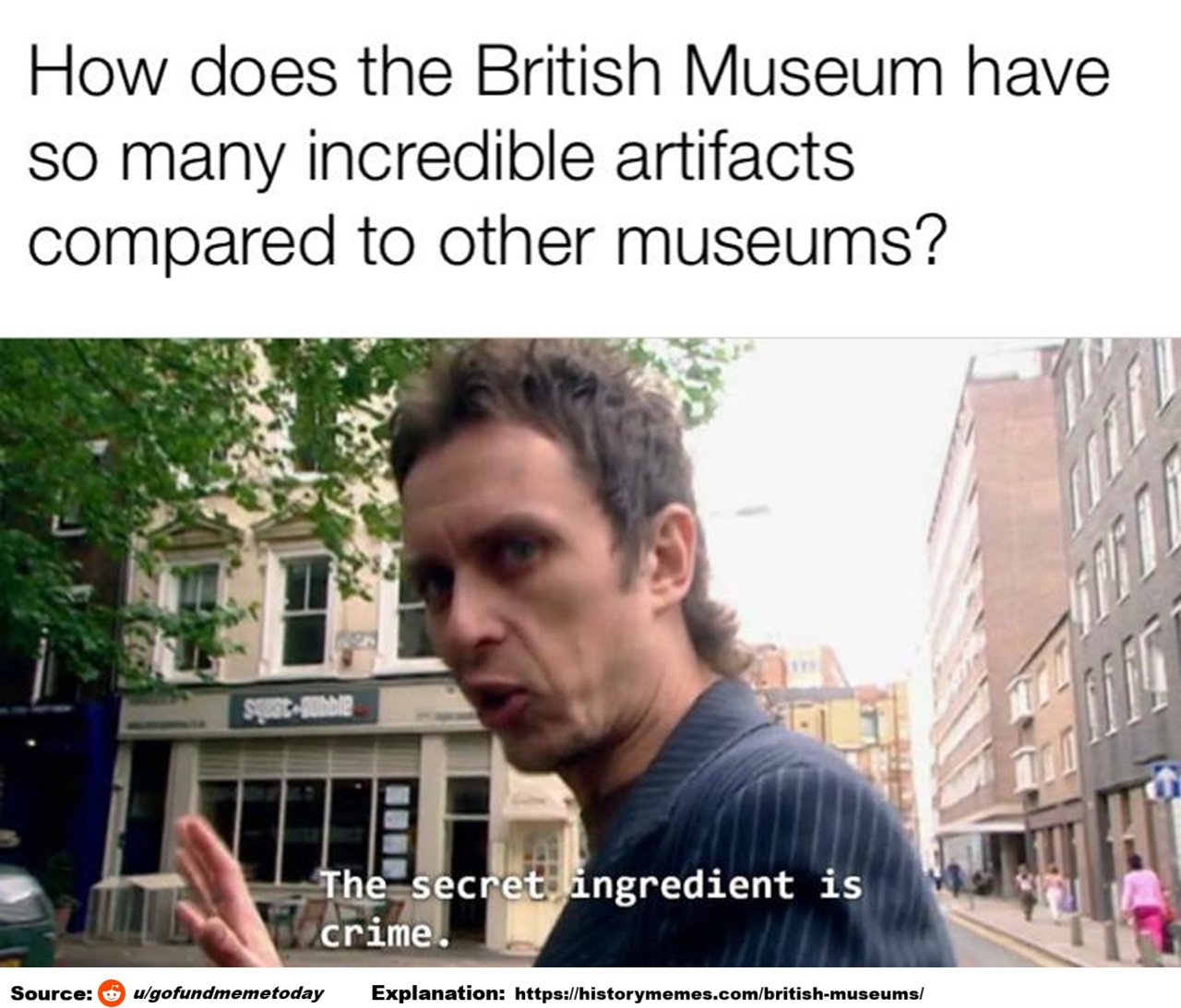 - Finally, it twists the format with “Or Britain how they got so many artifacts in their museum” (a satirical comment on how many items in British museums, such as the British Museum, were taken from former colonies or acquired under questionable circumstances during the British Empire).